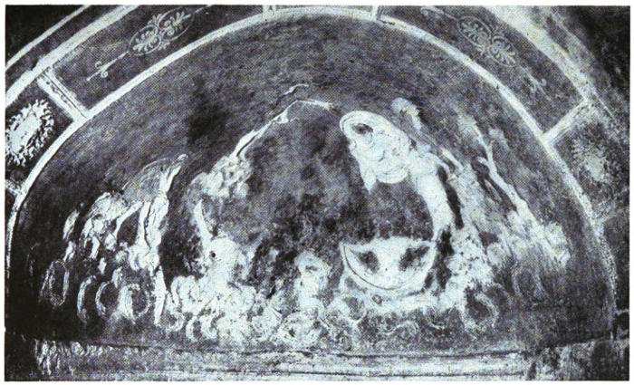 In an underground building found in Rome near the Porta Maggiore, showing to the left Apollo with lyre on the cliff, and to the right Sappho about to step off the rock into the sea, where a Triton waits with outspread garment. Behind Sappho higher up on the rock a winged Eros