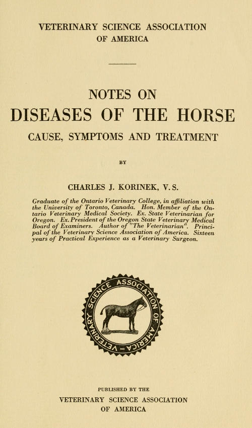 This treatise on the diseases of horses has been written with the primary purpose of placing in the hands of the Student and the Veterinary Profession, a book of practical worth; hence, all unnecessary padding is omitted, so that the reader may quickly grasp the knowledge of the subject or disease for which he may be seeking.