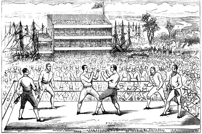 4. “Fighting upon a Stage.—Some little difference of opinion having existed upon the merits of the case between Langan and Spring, the majority of the supporters of pugilism assert, according to milling precedents, that if Spring intended to retain the title of Champion, he could, nay, he ought not to have refused to fight Langan upon a stage, as the following circumstances support the claim of Langan. It appears that Jack Bartholomew thought he had not fair play in the ring when he fought with Jem Belcher; and upon Bartholomew’s soliciting Belcher to give him a chance upon a stage, he replied, “Any where; a saw-pit, if you like.” Again, when Molineaux entertained an opinion that he had not justice done him in a ring with Cribb, the latter veteran answered the request of the man of colour, with a smile upon his face, “Yes, upon a stage, the top of a house, in a ship, or in any place you think proper.” It is likewise insisted upon by the admirers of boxing that the advantages are all upon the side of Spring. He is the tallest, the heaviest, and the longest man, with the addition of his superior science into the bargain. Most of the prize battles formerly were fought upon stages—Tom Johnson with Perrins, Big Ben with Jacombs, and George the brewer with Pickard; Johnson with Ryan, Johnson also with Big Ben, Mendoza with Humphries, Ward with Mendoza, Tom Tyne with Earl, etc. It is also worthy of remark, that none of the above stages were covered with turf. The only instance that bears upon the point respecting “turf,” is the stage which was erected at Newbury, upon which Big Ben and Hooper were to have fought. This was covered with turf, but the magistrates interfered; the fight was removed to some miles distant. Big Ben and Hooper fought on the ground in a ring.”—Pierce Egan.