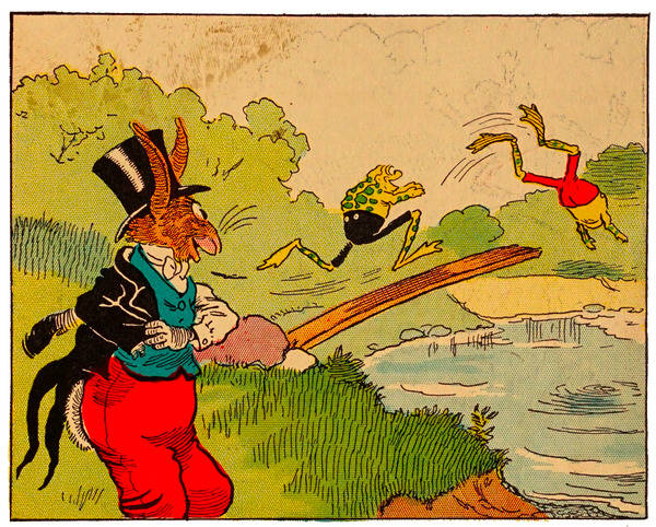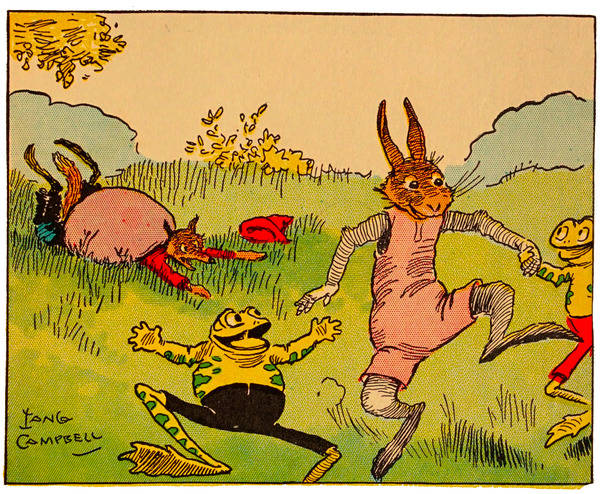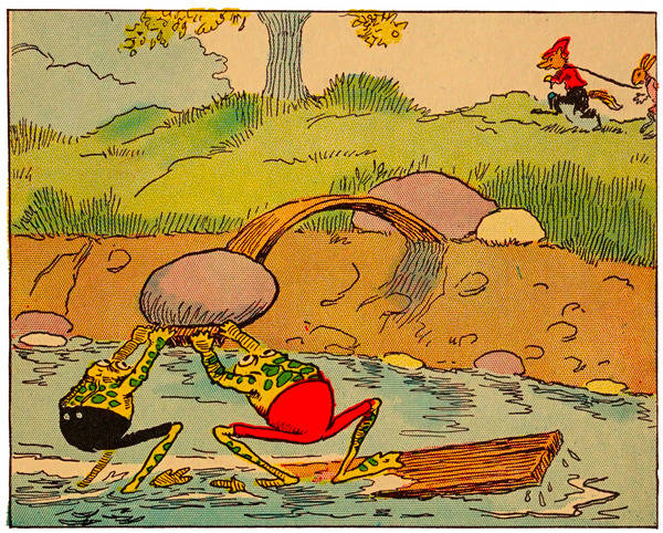 4. “I guess you had better not try any more swimming or diving,” said the frog boys to Uncle Wiggily, after they had pulled him out of the mud where he stuck upside down. “I think you are right,” agreed the rabbit gentleman. So Bully and Bawly made a raft and Uncle Wiggily rested easily on it while the froggie boys poled it about the pond. And then—the Fuzzy Fox crept softly to the pond’s edge.