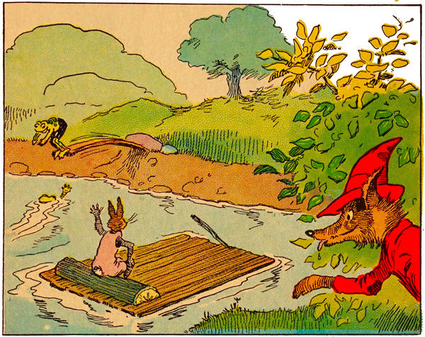 5. “Well, boys, I think you’ve given me a long enough ride,” said Uncle Wiggily after a while. “Just push the raft toward shore and I’ll dress.” So the raft was shoved toward shore. The Froggie boys began leaping in from the spring board and the Fuzzy Fox went down to the water’s edge to wait for the rabbit to come ashore. “And then how I will nibble his ears!” thought the Fox, smacking his lips.