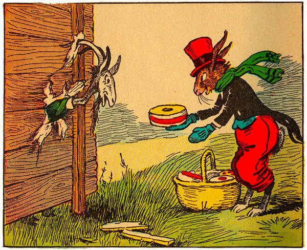 3. Leaving thankful Mr. Twistytail, Uncle Wiggily saw Uncle Butter the goat. Uncle Butter was running toward a fence on which was posted the picture of another goat. “Ah,” said Uncle Wiggily, “my friend is going to have a little morning exercise. He is going to see how strong his horns are. He must be thankful that he is so strong. I’ll give him a cake after he bangs the picture goat. He can’t hurt him.”