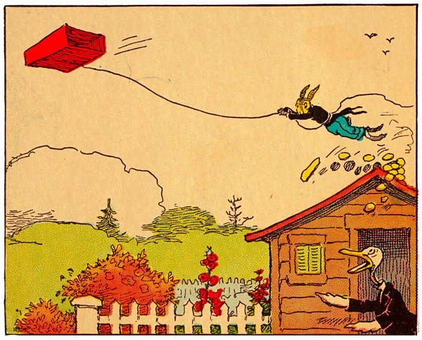 4. At first Uncle Wiggily was so surprised at being carried off by the kite, he didn’t know what to do. Then he tried to loosen the cord from around his waist, but it was tied in a hard knot. Straight toward Grandpa Goosey’s house the kite took Uncle Wiggily. “Bang!” the bunny’s paws knocked off the chimney. “Hi there!” cried Grandpa Goosey. “Please excuse me! I couldn’t help it!” shouted the bunny.