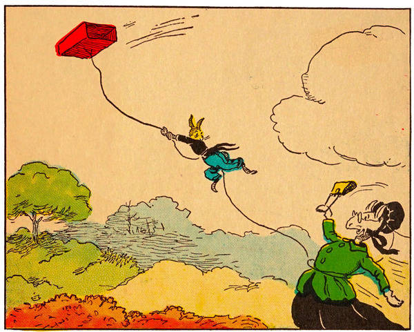 5. Sailing on, after knocking off Grandpa Goosey’s chimney, Uncle Wiggily was carried higher and higher by the big kite he had made. “I guess Nurse Jane was right,” he said to himself. “Something terrible is going to happen!” Just then the bunny felt a tug at the loose end of the kite string. He looked down. “Oh, you’re taking me away!” bleated Aunt Lettie. “Worse and worse!” said Uncle Wiggily.