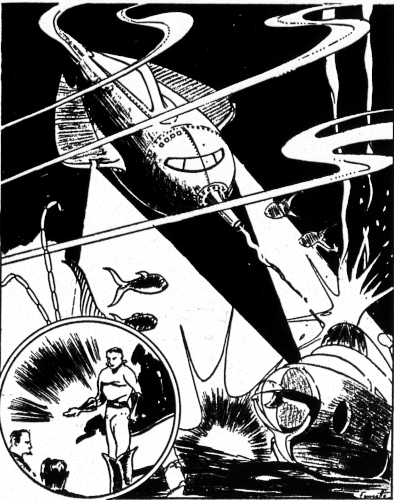 The craft plunged for the surface of the hard ocean, at frightful velocity; struck; penetrated; was under, velocity broken almost in three by the terrific impact. The ship bored down, powerful searchlights playing on swarms of startled fishes. Down, down. The pilot made an exclamation, grinned his triumph. Here, ten miles down, they saw the hulk of the ship that was causing such destruction in the world above.