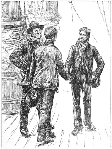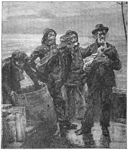 The cook, or “doctor,” as he is almost always called on 17board the fishing schooners, and, in fact, on most vessels, was a short, thick-set Portuguese, almost as dark as an Indian, but the very picture of good-nature. He now stepped up behind the skipper so as to have a good view of the baby, whose face, which rested on the skipper’s shoulder, was turned away from the crew, who stood looking at him in a helplessly bewildered way.