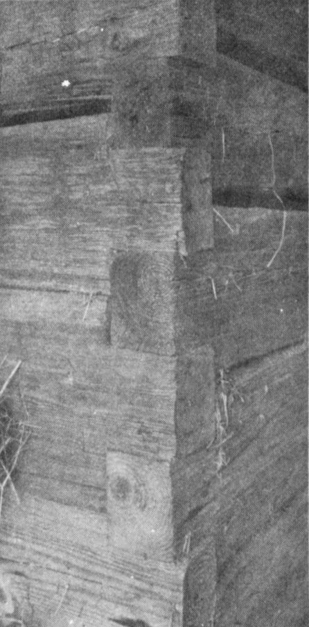The north pen was added some twenty years later. The split-logs of pine are put together with V-notching. An unusual feature is a storm-pit built under the north pen with an entrance through an opening in the floor.