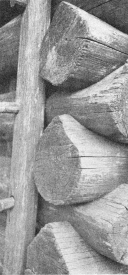 Some of the houses were built with whole peeled logs (Fig. 4); others with split logs (Fig. 5) and still others with square-hewn logs (Fig. 6). The logs were notched or “scribed” at the corners to fit securely and steadily. The style of the notch varied with the cultural background, skill or preference of the builder. Saddle notching, V-notching, Half-dovetailing, Square cornering, Halved cornering and a saddle-V combination are found in the Piney Woods (Figs. 7-12). Of these, the half-dovetail is the most difficult to produce. It is self locking, as is the Saddle and V-notch, while the Square and Half-Square require the use of pegs to hold the timber in place.