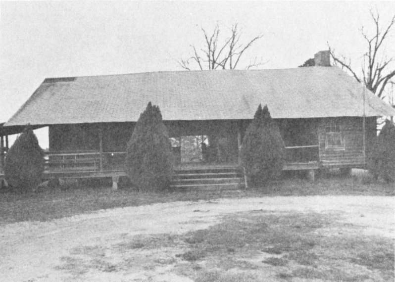 Serving a special function were the campgrounds where Protestant religious meetings were held once or twice a year, usually during “laying-by” time. The early camp meetings were held in an arbor-like shelter constructed of oak posts with V-tops forming a frame for horizontal poles that were then covered with leafy branches. This shelter was called the tabernacle. Rough plank seats were constructed by laying long planks on supports held up by stakes driven in the ground. The dirt floor was covered with pine straw or sawdust to keep the dust down and the pulpit was made of rough planks. Smaller shelters called tents where the people camped out were built around the tabernacle and furnished with pine plank or pole beds and tables, straw and shuck mattresses. Later more substantial campgrounds, such as present-day Salem Church campground, were built with a permanent tabernacle and sturdy cabins. The Salem Campground on the Jackson-George County line is the oldest extant campground in the state (Fig. 27). The first camp meeting at Salem was held in 1826 and the present site was selected in 1842. The campground today is still arranged in the original U-shape, but the materials of the buildings have been replaced. The tabernacle is built of rough lumber, with three sides open and log posts supporting the roof. The floor, covered with pine straw, holds wooden benches which can seat 300 people. The cabins which surround the tabernacle are still traditionally known as “tents.” Each cabin has two rooms, one for sleeping, one for eating, cooking, or sitting, and the floors are covered with pine straw. A wooden bench adorns each front porch. The oldest tent on the campground is the Parker tent built around 1880. Meetings have been held every year at Salem Campground since 1826 except for two years during the Civil War.