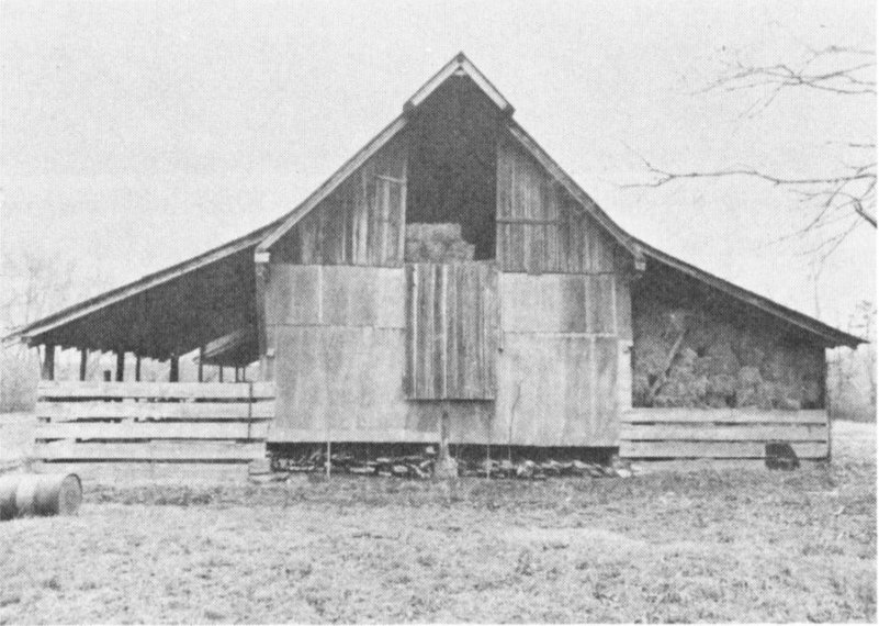 Although roof styles vary, the barn type used almost exclusively in the Piney Woods is the transverse-crib barn. Henry Glassie, folk historian, has theorized that the transverse-crib barn developed in the southern Tennessee Valley. The Piney Woods settlers came from that area in large numbers. Roof styles include the gambrel and the pitched roof, but the most prevalent style is the A-roof (Figs. 30-32).