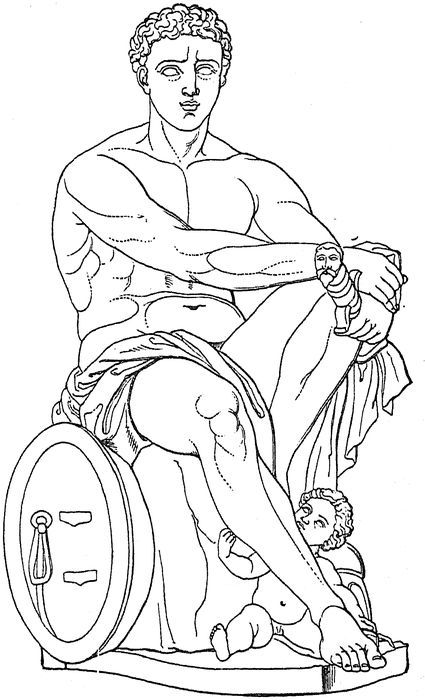 In Heracles ancient art sought to portray the conception of gigantic bodily strength. He is, therefore, generally represented as a full-grown man—rarely as a child or youth. We may observe the manner in which the prominent idea of physical force is expressed by regarding the formation of the neck and throat in the statue of Heracles. Nothing can express better a bull-like strength than the short neck and the prominent muscles, especially if associated with a broad, deep chest. We shall be able to appreciate this distinctive character still more clearly if we compare the form of Heracles with that of the ideal god Apollo, whose neck is especially long and slender. The figure of Heracles is, moreover, characterised by a head small in comparison with the giant body; by curly hair, bushy eyebrows, and muscular arms and legs. This conception was principally developed by Myron and Lysippus. A statue of Heracles by the former artist played a part in connection with the art robberies of Verres in Sicily. Lysippus erected several celebrated statues of Heracles, the most remarkable of which was the bronze colossus in Tarentum, which the Romans, after the capture of that town, transferred to the Capitol. Thence it was brought, by order of Constantine, to his new capital of Constantinople, where it remained until the Latin crusade of 1202, when it was melted down. Lysippus portrayed in this statue a mourning Heracles, which no one had ever attempted before him. The hero appeared in a sitting posture, without his weapons, his left elbow resting on his left leg, while his head, full of thought and sorrow, rests on the open hand. The same artist, in a still greater work, depicted the twelve labours of Heracles. These formed a group which was originally executed for Alyzia, a seaport town of Acarnania, but which was, subsequently, likewise transferred to Rome.