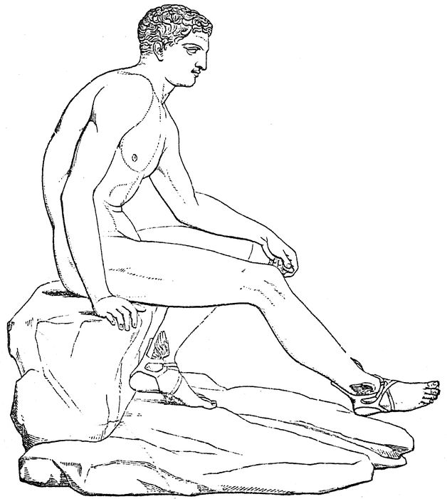 Art has followed the example of the poets and mythologists in depicting Theseus as a second Heracles. Here, however, the characteristic differences that existed between the Doric and Ionic races become apparent. Just as the latter race surpassed the former in elasticity, both of mind and body, so their national hero gives token not only of a higher intellectual being, but also of a body more lithe, and capable of greater swiftness and dexterity, than that of the Doric hero. The slighter and more elegant form of Theseus lacks, perhaps, the sheer brute strength of Heracles, but is compensated by the possession of a far greater degree of activity and adroitness. The expression of face is more amiable and the hair less bristling than that of Heracles, while there is generally no beard. Such is Theseus as depicted by Greek art at the epoch of its full development; later art strove 227to render the form of the body still more lithe and graceful. The costume of Theseus consists, like that of his prototype Heracles, of a lion’s skin and club; sometimes also of the chlamys and petasus of the Attic youth. Existing art monuments are far less numerous in his case than in that of Heracles. If the explanation is correct, the British Museum possesses a Theseus of priceless value. Among the statues of the Parthenon which have been preserved, there is one of a figure negligently reclining on a lion’s skin, which, with the exception of the nose, hands, and feet, is in a tolerably good state of preservation (Fig. 59). It belonged to the great group of the east gable, which represented the first appearance of the new-born Athene to the astonished gods. It is the figure of a youth in his prime, somewhat larger than life, and altogether a perfect ideal of manly beauty.