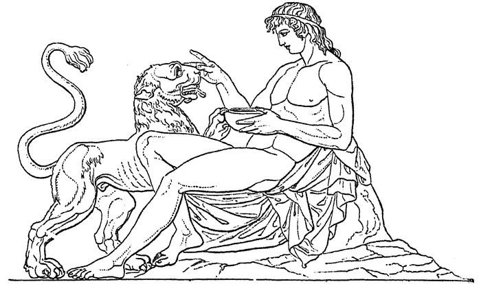 3. Parerga (Subordinate Deeds).—First among these come the scenes from his contest with the Centaurs, which were frequently treated of in art. Groups of these exist in the museum at Florence; there are also various representations to be found on vases. His adventure with Nessus is represented separately on a Pompeian painting in the Naples Museum; Nessus crouches in a humble posture before Heracles, who has the little Hyllus in his arms, and he appears to be asking permission to carry Deïanira across the stream. There is also an interesting representation of the release of Prometheus on the Sarcophagus of the Capitol, from the Villa Pamfili, which is, in other respects, also worthy of mention. The seizure of the tripod at Delphi is also frequently portrayed in art.