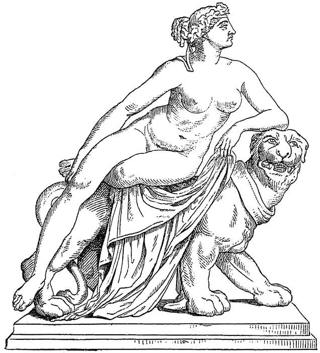 4. Heracles and Omphale.—Of the monuments referring to Heracles’ connection with Omphale, the most important is the beautiful Farnese group in marble in the Naples Museum. Omphale has thrown the lion’s skin round her beautiful limbs, and holds in her right hand the hero’s club. Thus equipped, she smiles triumphantly at Heracles, who is clothed in female attire, with a distaff in his hand.