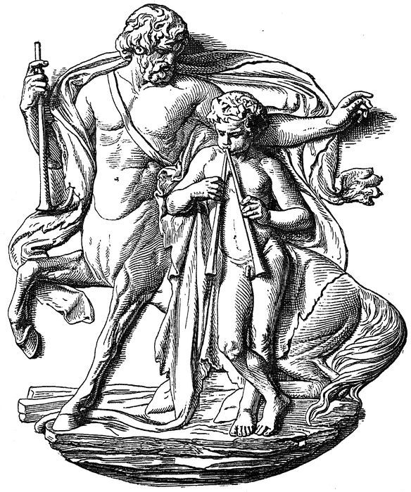 He was the son of the Athenian king Ægeus, whom mythological tradition made a great-grandson of Erechtheus. After his father Pandion had been driven out by his relations, the sons of Metion, Ægeus betook himself to Megara, where he was hospitably received by the ruler, Pylas. From Megara, Ægeus, Pallas, Nisus, and Lycus, the sons of Pandion, undertook an expedition against Athens, which ended in the expulsion of the Metionidæ, and the restoration of the former royal family in the person of Ægeus. Such, at least, is the tradition; although it is more probable that Athens never had a king of this name, and that Ægeus (wave-man) is only a surname of Poseidon, the chief deity of the seafaring Ionians. Ægeus, though twice married, had no heir, and now undertook a journey to Delphi to seek the advice of the oracle. On his way back he stopped at the court of Pittheus, king of Trœzen, and became, by his daughter Æthra, the father of Theseus. Before his departure, he placed his sword and sandals beneath a heavy stone, and commanded Æthra to send his son to Athens as soon as he was able to move the stone and take his father’s sword. Theseus was carefully trained in music and gymnastics by the sagacious Pittheus, and soon developed into a stately youth. He is also supposed to have been educated by the Centaur Chiron, whose instruction had now become a necessary item in the education of a real hero.