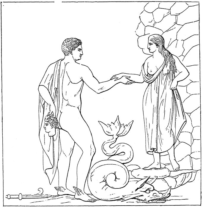 On reaching Athens, he found his father Ægeus in the toils of the dangerous sorceress Medea, who had fled from Corinth to Athens. She was on the point of making away with the newcomer 222by poison, when Ægeus, fortunately, recognised him by the sword he bore, and preserved him from his impending fate.