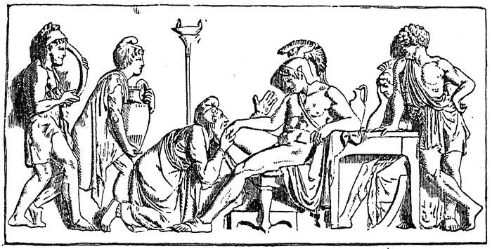 260The events of the Trojan cycle have supplied not only the poet, but also the artist and the sculptor, with a large number of their most acceptable subjects. Single scenes, such as the judgment of Paris, have been continually selected, ever since the time of Raphael, as favourite subjects of representation. Of modern masters, Carstens, Thorwaldsen the great Danish sculptor, Cornelius, Genelli, and Preller (Landscapes of the Odyssey) have illustrated the story of Troy in a series of splendid compositions. We give an engraving of a relief by Thorwaldsen, representing Priam before Achilles (Fig. 62).