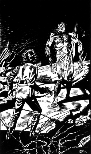With incredible strength he tore away the protecting mass of his space suit. The cold wind hit him, knifed him through and through. And he stepped forward. Walking, walking, and suddenly his great hands rose aloft in an agony of sorrow. His mighty voice bellowed above the elements of loneliness, of despair. And always, those grotesque, storm-swept, misshapen creatures fastened their wet, glistening eyes upon him and in the depths of them displayed rage as he displayed it; despair as he displayed it. And when he pounded his clenched fists in powerful blows upon his resounding chest, they pounded their gnarled limbs upon their shrunken chests in powerful mimicry.