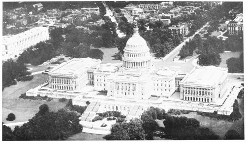Fig. 1—The National Capitol, Washington, D. C. A view obliquely downward from a position over the National Botanical Garden, showing the western front of the Capitol at the approach to it from Pennsylvania Avenue. In the background, at the right, can be seen a part of the Library of Congress and, at the left, a part of the Senate Office Building. The radiating avenues of approach are of interest as well as the character of the district surrounding the Capitol, as indicated by the apartment houses and tree-lined streets.