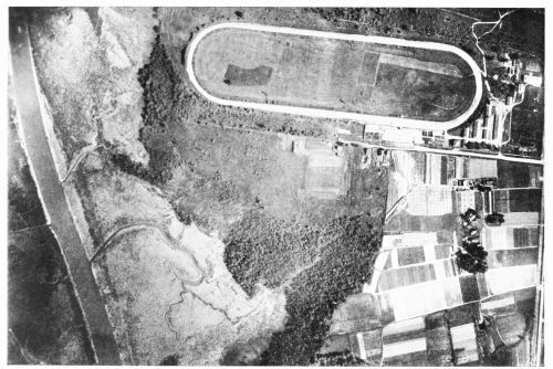 Fig. 12—Benning, D.C., and the Anacostia River, showing, from right to left, cultivated lands 40 to 20 feet above sea level, an elevation too slight to be shown in a vertical photograph; a brushy slope running from 20 feet to sea level; and marshland along the stream. The checkered pattern of the upland fields is caused by different-colored crops. Shocks of corn, spaced evenly in rows, buildings and shade trees, and light-colored roads and a race track are shown. The light-colored areas along the stream are occupied by tidal marsh and are free from brush but covered with vegetation of annual growth. The figure is one of the photographs used to make the mosaic shown on Fig. 13. It should be compared with Fig. 13 and with the topographic map, Fig. 14. Scale, 1: 11,000.