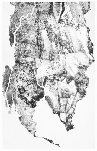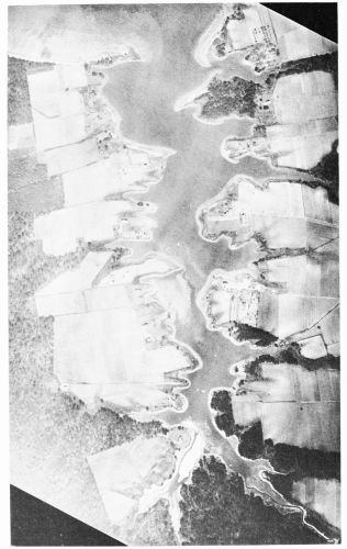 Fig. 15 (on page 24)—Mosaic of the southeastern part of Mulberry Island, on the left bank of the James River about 11 miles northwest of Newport News. Va., showing an area portrayed by many photographs matched together. Slight differences in shade indicate the junction of the separate prints. The higher land, about 10 feet above sea level as determined by surveys on the ground, is shown at the right by roads and cultivated fields. It is to be noted that roads outline the dividing line between the high ground and the marsh. At the left are lower areas of wooded or brushy swampland and of grassy marsh. They contain a number of abandoned channels: some completely silted up, others containing small thoroughfares, and still others drained by meandering streams which seem to have developed after the channels were definitely abandoned by the streams which originally occupied them.