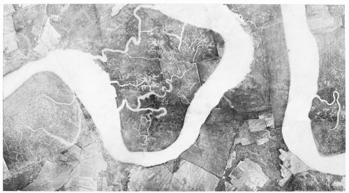 Fig. 24—Sweet Hall Marsh on the lower Pamunkey River, near West Point, Va., as photographed from a height of 10,000 feet at 11 A.M., December 11, 1920. Cousaic Marsh lies to the left and Hill Marsh to the right of the central meander. Some of the watercourses in these marshes are thoroughfares, or channels opening to the river at both ends, that can be traversed by boat at high tide. But many of them are quite different in nature, beginning as minute rills and broadening toward the mouth in a manner suggesting typical drainage channels on higher land. Scale, about 1:31,000.