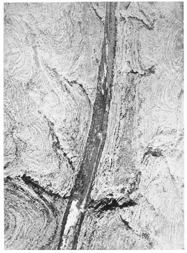 Fig. 20—Details of marshland. A part of Lee Marsh near West Point, Va. (cf. Fig. 26), as photographed from a height of 2,000 feet, June, 1920. Local observers report that this marsh has been submerged only twice in nineteen years. The drainage systems are well entrenched. The larger stream channels are cut 1 to 5 feet or more below low tide (the tidal variation at West Point is about 3.4 feet), and their form is made stable by the tough surface crust of the marsh, consisting of the matted roots of the luxuriant sedge grass. The intricate, veinlike appearance of the drainage lines and the furry appearance of the edges of all the waterways, showing overhanging vegetation, are of interest. Drainage systems flowing in opposite directions slow connecting tributaries apparently silted up. Scale, about 1:4,000.