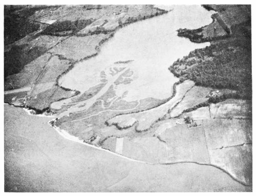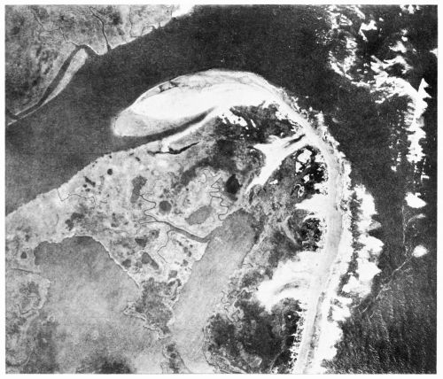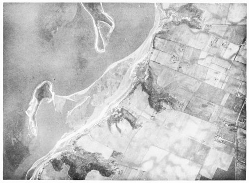 Fig. 26—Eltham Marsh on the lower Pamunkey River, as photographed from an altitude of about 10,000 feet at 11 A.M., December 11, 1920. At the right lies the town of West Point, Va., at the junction of the Mattaponi and Pamunkey Rivers, and at the left appears a part of Lee Marsh. Eltham Marsh, in the center of the illustration, is traversed by a so-called thoroughfare, through which boats of light draft make their way at high tide. At one point in the middle of the marsh the thoroughfare is perceptibly broader than elsewhere, and the tidal currents entering from opposite ends of the thoroughfare meet there and cause slack water in which silt is deposited, forming mud flats exposed at low tide. The cultivated fields south of the marsh are on a bench about 10 feet higher than the marsh. Scale, about 1:31,000.