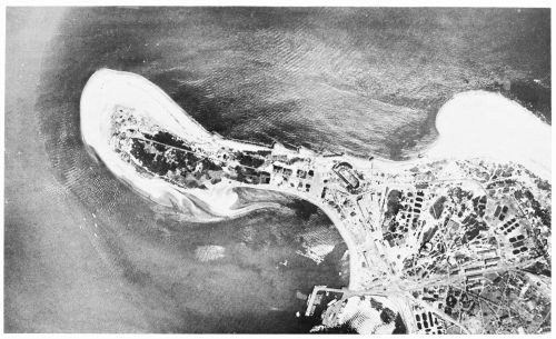 Fig. 11—Landscape gardening. An airplane view of a part of Long Branch, N.J., taken from a height of 10,000 feet, showing the beach and surf at the right, and the streets, mansions, driveways, and lawns in the body of the picture—an example of the development of a barrier beach of little value before the exploitation for summer {19}homes. Scale, about 1: 15,000.