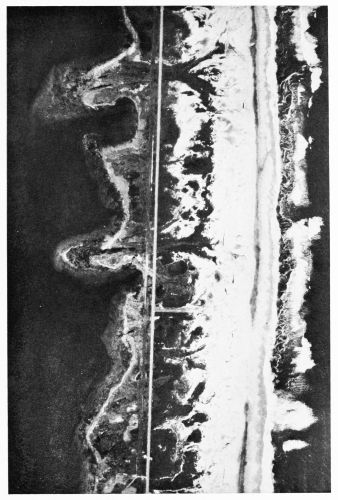One of the most striking characteristics of marsh topography illustrated by the photographs presented here is the great wealth of drainage lines and the resemblance of the drainage patterns to those of river systems developed on higher ground. The dendritic patterns, the meanders, and the sharply outlined divides are surprising in areas which have altitudes varying from only a few inches to a little more than a foot at times of ordinary high tide and which are wholly submerged at times of maximum tide. Some of the streams have gently winding courses suggestive of normal stream development. Others, particularly the smaller, have a conspicuous angularity of course. It is possible that the latter may have originated as the trails of animals. Some of the lines are observed to cross the larger streams and are probably tracks made by muskrats. Some of the streams rise close to the river’s brink and lead to through-going waterways near the center of the marsh. This suggests the deposition of silt on the brink of the river at times of high water. The notched appearance of the shore in Figure 20 seems to be due to overhanging bunches of sedge grass and, in some instances, to the breaking away of the surface mat or crust of the marsh formed by the interlacing roots of grass. The mottled appearance of the marsh in this picture may be partly due to shadow of clouds, but to some extent, at least, the difference in shade is caused by differences in the character of the plants.
