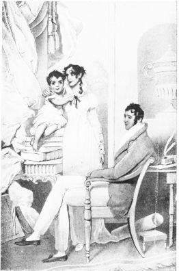 William Makepeace Thackeray, the only child of Richmond and Anne Thackeray, was born at Calcutta on July 18th, 1811. He was descended from Yorkshire yeomen who for several generations had been settled at Hampsthwaite, in the West Riding. In 1766 his grandfather, likewise named William Makepeace Thackeray, sailed for India at the age of seventeen, to enter the service of the East India Company. Under Cartier, the predecessor of Warren Hastings as Governor of Bengal, his promotion was very rapid. In 1776 he married Amelia Richmond, and the same year returned to England. His fourth son, Richmond Thackeray, father of the novelist, went to India in 1798 also in the service of the Company. In 1807 he became Secretary to the Board of Revenue at Calcutta, and undoubtedly possessed brilliant gifts for administration and public work. He married on October 13th, 1810, the reigning beauty of Calcutta, Anne, daughter of John Harman Becher. The painting by Chinnery, executed in 1814, gives a glimpse of the Thackerays at the time when their son had reached the age of three years. He is drawn perched on a large pile of books, with his arms round his mother’s neck, his father stiffly seated in a chair close by.