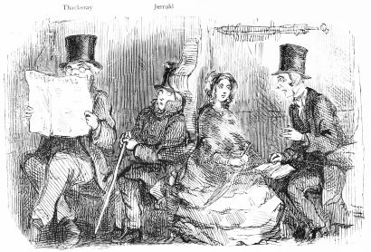 During the same year “The History of Samuel Titmarsh and the Great Hoggarty Diamond” commenced to run its course in Fraser’s Magazine. Punch had been started on July 17th, and Thackeray’s first contributions appeared the following June. In the course of his ten years’ connection with this periodical he contributed something like 500 sketches irrespective of letterpress. One of these, reproduced on page 12, is taken from a series entitled “Authors’ Miseries,” and represents Jerrold and the artist himself in a railway carriage listening to the other occupants discussing the members of the Punch staff:—