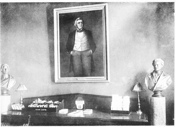 Thackeray, who for some time had been a member of the Garrick Club, was elected to the Reform in 1840, being proposed by Mr. Martin Thackeray and seconded by Mr. Henry Webbe. Sir Wemyss Reid gives an interesting description of the author at this Club. “Again and again I have heard descriptions of how he used to stand in the smoking-room, his back to the fire, his legs rather wide apart, his hands thrust into the trouser-pockets, and his head stiffly thrown backward, while he joined in the talk of the men occupying the semi-circle of chairs in front of him.... To some of us, at least, the Club is endeared by the thought that he was once one of ourselves; that he sat in these chairs, dined at these tables, chatted in these rooms, and, with his wise, far-seeing eyes surveyed the world from these same windows.” In the strangers’ room at the Reform Club hangs a portrait of Thackeray by Samuel Laurence. On one side of it{38} there stands a bust of Sir William Molesworth, on the other of Charles Buller. The latter seconded Thackeray when he was proposed by the Rev. W. Harness as a member of the Athenæum on February 12th, 1846. Thackeray was elected to this Club in 1851 under the rule which provides for the introduction of “persons of distinguished eminence in science, literature, or public services.”
