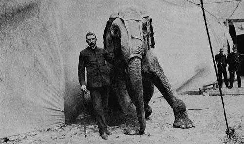 Adam Forepaugh was as ready a man in an emergency as circus life ever developed, and was noted in the business for his skill in avoiding legal entanglements. A resident of Auburn, N. Y., does not know to this day how neatly the showman escaped a claim for damages at his expense. The man had been drinking heavily, and in the menagerie tent before the performance had begun offered Bolivar, an elephant noted for his size, a bottle filled with whiskey. The smell of the liquid always infuriates the beasts. In the spring of 1902, Tops, a usually good-natured elephant, stamped the life out of a man who offended her with whiskey, in Brooklyn, N. Y. The Auburn man was chased away unharmed by the watchful keepers, but Bolivar’s small eyes gleamed vindictively and he did not forget. The performance was well under way, and the menagerie tent was being rapidly emptied of its collection of animals and cages, when the man returned. The elephants and camels were lined up preparatory to the[244] march to the cars. The scene was one of confusion and excitement, and the man was not observed by the attendants. Bolivar, however, had his eyes fixed on his persecutor and as the luckless stranger came within reach the big beast trumpeted, struck with his trunk and prepared to stamp upon the victim. Keepers rushed to the spot with pitchforks, subdued the angry elephant and dragged the unconscious form away. An examination showed no serious injury.