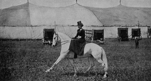 [232]Mrs. Walter Howard was the first circus equestrienne of public prominence. Sixty years ago, her simple performance fairly dazed spectators. She gave lessons in her art to many of the later woman riders and made a sensation by being the only woman at that time to cast herself through paper balloons. Alice Lake was a remarkably skilful horsewoman. Of the foreigners who came here, Madame Tounaire was easily the best performer. Her daughter, Molly Brown, was the first woman in this country to somersault on a horse, and few women since have accomplished the trick. Mrs. William Roland, Madame Dockrill, Adelaide Cordona, Louise Rentz, and Pauline Lee attained prominence. Linda Jeal was famous for several years and taught her niece, Dallie Julian, seventeen years old, the somersault.