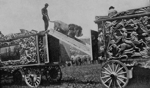 Through the gloom of night and the dusk of early morning the heavy circus train labors on its journey to transient destination. The distance diminishes slowly. Sometimes the line of cars is shunted to one side and stands patient and inert while expresses clatter by; again, its dragging weight defies the straining efforts of the engine, and it is left in solitary helplessness while the iron horse scurries off for aid; often the cars are rattled together with body-racking violence. Farmers in the barnyards rub their eyes in mute astonishment at the moving spectacle, and cattle scamper from fright. Other trains are in hot pursuit. Their burden, too, is man and beast and varied showy paraphernalia. Four or five sections are required to transport the vast and wondrous effects of the circus.