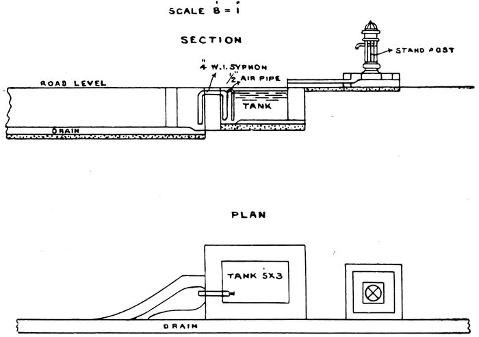 A type design of an automatic flushing tank is shown in Fig. 1. These cost about Rs. 100 each complete, the syphon pipe alone representing some Rs. 30. Where sufficient head is not unavailable for this type, Adams’ Patent Adamic Flusher may be 4suitable. These cost about Rs. 70 for a 4″ pipe size, and works with a head of 10 inches.