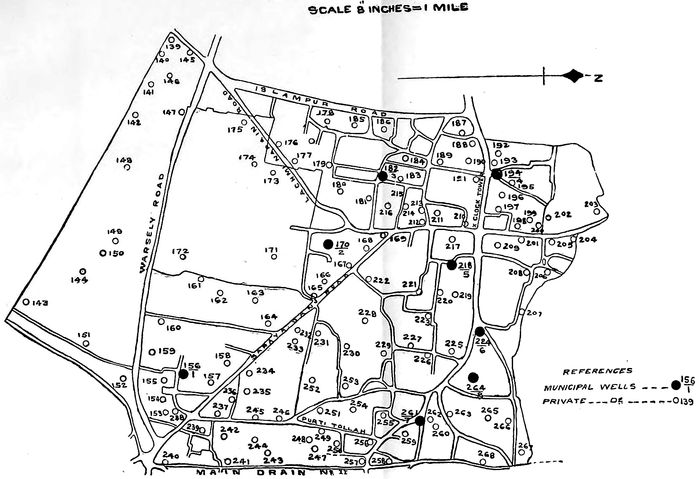 In order to obtain a comparatively pure water-supply, under circumstances existent in most bazaars, it is essential that the spill water from wells be led away by properly constructed drains beyond what is known as the cone of filtration; this may be described as a circle drawn round the mouth of the well, the radius being equal to the depth of it. Owing to Indian customs, there is always a considerable quantity of spill water in the vicinity of a well, and this, when proper platforms and drains are not constructed, finds its way back, after contamination, by the line of least resistance, either down the sides of the masonry lining, or by cracks and fissures in the ground. For water supplies from wells and tanks the main object is to prevent any water once drawn out, again, after probable contamination, flowing back into the source of supply. Arrangements should be made for registering every well in a municipality where this has not already been done, and for taking over, or closing all those the owners refuse, or fail to put in a proper sanitary state. In Bengal this can be enforced under section 200 of the Bengal Municipal Act (1894). A copy of the map of a ward showing the position of all wells and tanks therein is given in Fig. 3. The Well Register, which should be corrected yearly, is given in Appendix C, page 62. It is impossible in most cases, owing to large numbers, for a Municipality to take over, repair, and conserve all the wells (in the town of Muzaffarpur, there were 718 wells) but much good can be done by acquiring a certain number of the most useful unowned ones, and making the owners of others, when in a position to do so, put and maintain them in a sanitary state. When new wells are sunk, the owner must be made to construct them according to a standard design. Fig. 4 shows an inexpensive and good form of open well, top, and platform. From the experience of ten years in the Muzaffarpur District (from 1891 to 1901), where wells on the sides of main roads were so treated, this is possible. Some 400 wells on 725 miles of road were taken over by the District Board, put in a proper state of repair, suitable platforms and spill-water drains constructed, and arrangements made for annual cleaning out and disinfecting with permanganate of potash during the hot weather months. These were eventually greatly appreciated, and, whereas in the first instance difficulties were experienced in getting hold of suitable ones, it was of late years necessary to make careful selections from the applications received. In addition to this, the owners of numerous ones, on whom notice was served that if they did not put them in a sanitary condition, they would be taken over and repaired by the District Board, elected to do the work on the prescribed lines at their own expense. It is a notable fact that cholera when prevalent in villages close by, frequently is not found in those where these wells are situated. This organization is being extended to villages which have an especially bad sanitary record. For easy reference the Instructions for Repairing, Cleaning and Disinfecting Wells are quoted.