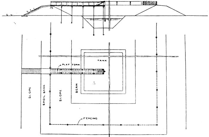Another and a cheaper method is shown in Fig. 10, page 15. Here the tank is completely fenced in with the exception of an entrance to a platform which extends towards the centre of the tank from which the water can be drawn by hand. Model rules for clearing out and re-excavating tanks are as follows:—