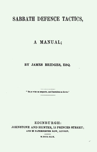 4. Such being the doctrinal test of the true Sabbatarian, it may not be amiss to add, that there is a practical test which has been found valuable, viz., that he repudiates all systematic Sabbath railway traffic, whether morning or evening, and whether for man or mail—hating post-office traffic equally with railway traffic. He rejects the morning and evening scheme both on principle and on policy—on principle, because he holds all portions of the day equally holy; and on policy, because he knows that the iniquity once insinuated into a portion of the day will diffuse itself over the whole; and that the public, once swallowing the little bait, and committing the little sin, will become familiarised with the whole evil, and soon have neither moral principle nor courage left to oppose its out-and-out establishment. In regard, again, to the mail train, this is certainly, in the Sabbatarian’s p. 19eyes, as bad; he probably regards it as worse than the other. The combination of both is just a double iniquity, with this aggravation, that the post-office work is a national offence, sending worldliness in all the infinite varieties of correspondence into houses and families, which, but for it, might have enjoyed the blessing of one day’s repose in seven from the destructive tear and wear of life.