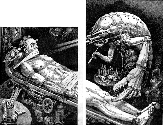 "Looks like our friend Zuggoth never heard of an anesthetic," he muttered, with an attempt at casualness he did not feel. "Funny thing, Pete, it still doesn't seem real. All this, I mean. Just a few hours ago we were in a skiff, fishing for blues. Now—"