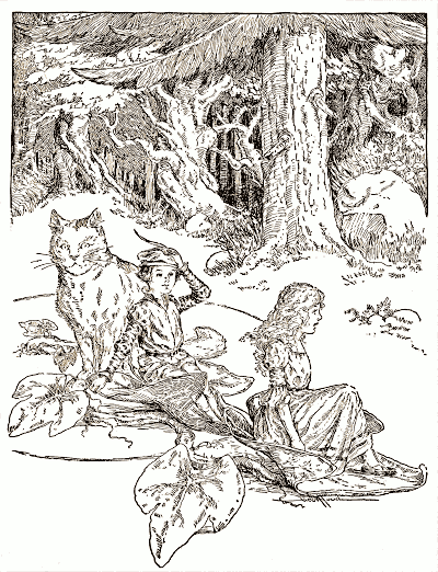 With these words, Tom arose and held his tail straight out like the handle of a saucepan; the two children took hold of it, off they all went, and in less time than it takes to tell it, they were on the borders of the great forest, at the foot of an immensely tall pine-tree. The cat made Princess Hilda and Prince Frank sit down on the moss that covered the ground, and sat down in front of them with his tail curled round his toes.