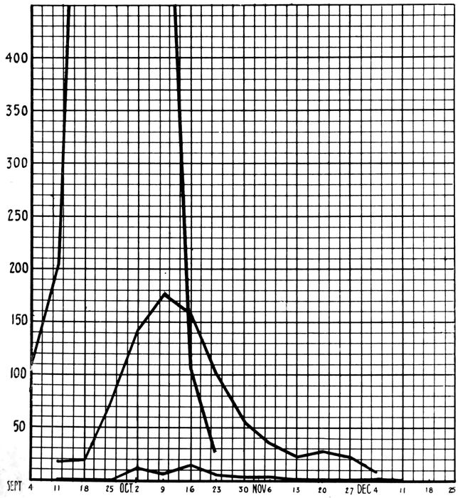 The existence of an epidemic of influenza at Camp Pike was recognized on September 23, when 214 cases of influenza were admitted to the base hospital. Preceding this date and beginning September 1 there had been a gradual increase of the number of patients admitted with the diagnosis of acute bronchitis. It is noteworthy that the demonstration of B. influenzæ had been regarded as essential for a diagnosis of influenza and since this microorganism had not been found, instances of acute inflammation of the respiratory passages with the symptoms of influenza were classified under a variety of names.