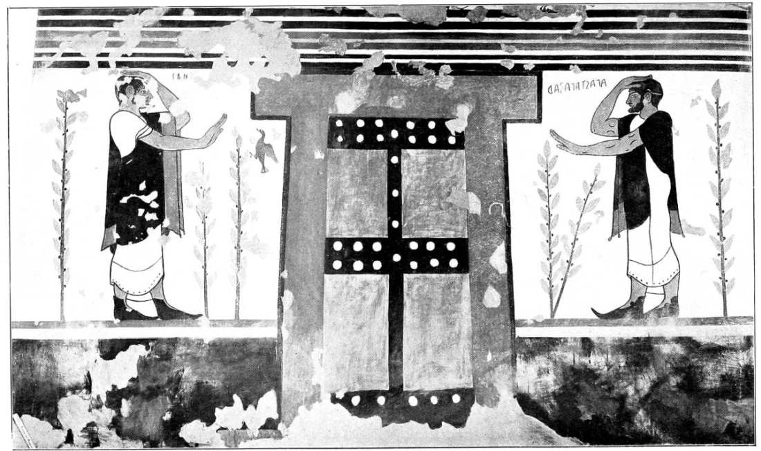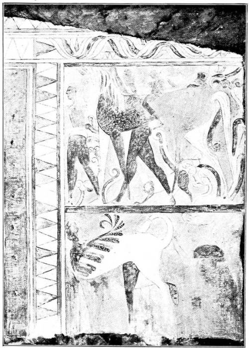 Thus in the Tomba dei Tori, besides a decorative treatment of the wall surface with friezes, we have a main picture with a mythological subject, painted in the Greek spirit and perhaps actually executed by a Greek mural painter. We do not find even the slightest allusion to death or entombment, or the least trace of any Etruscan characteristics. The inscription in the large frieze is of interest because it shows the Etruscan language in its archaic form, with a rich vocalization which must have made it much more euphonious than the language spoken later, in the fourth or following centuries. The inscription runs: ‘arnth spuriana s[uth]il hece ce fariceka,’ and means, ‘Aruns Spurinna monumentum sepulcrale ... condidit, adornavit,’ or the like.9