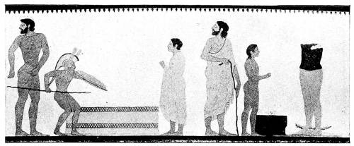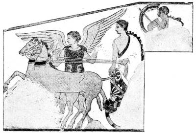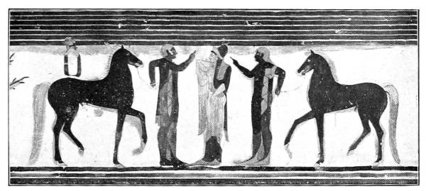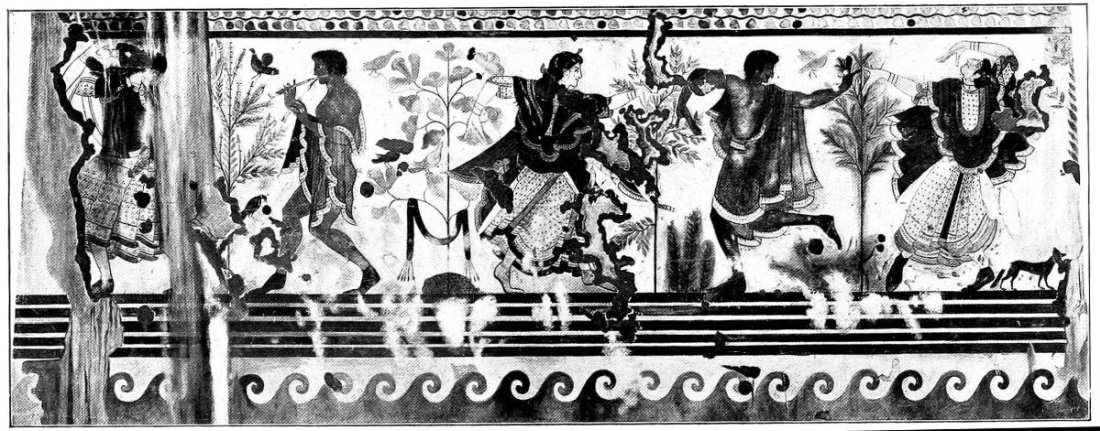 A considerable group of Etruscan tomb-paintings, dating from the middle of the sixth century, show in their composition close connexion with Ionic vase-painting, especially with the so-called Caeretan hydriae, while their main pictures tell us something about the Etruscans themselves and their conceptions of Life and Death and Eternity. Only in the animal friezes beneath the painted roof-supports does the old decorative conception of the human and animal figure still linger; elsewhere the pictures now have content and meaning.