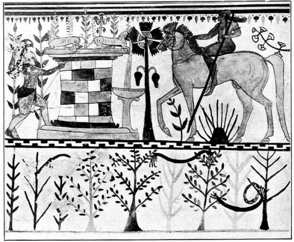 The next stage in the development is represented by the Tomba dei Tori at Corneto, discovered in 1892 and admirably published by G. Körte in Antike Denkmäler.7 The back wall of the main chamber in this tomb has two doors, and it is between these that the one large figure painting is placed, again in such a way as to suggest a tapestry stretched on the wall (fig. 2). But now the picture has a narrative content, inasmuch as a scene from the Greek cycle of myths is depicted: Achilles watches for the Trojan prince Troilus at a well. Achilles, to the left, wears a crested Corinthian helmet, sword, greaves, and red loin-cloth. Troilus is naked and only decorated with armlets and elegant shoes. He wears his hair long, according to Ionic fashion, and in his hand he carries a goad (kentron). This is, as a rule, only used when two horses are ridden, and the drawing shows traces of double contours near the head and the right leg of the horse; it is probable, therefore, that two horses were originally planned. In this picture also, the proportions of man and horse are impossible, but progress is perceptible in the monochromatic treatment of the body and legs of the horse. On the other hand, the old manner of painting in stripes or compartments is still retained in the running chimera in the pediment above; it also lingers for a very long time in the pedimental figures of the following period. The style is Ionic of the first half of the sixth century B.C. A truly Ionian monster, created under Oriental influence, is the human-faced bull in the pediment above the door, one of the two bulls from which the tomb derives its name, and which are omitted here because of the obscene groups on either side of them. Other decorative details point to Cyrene and Egypt, especially the characteristic frieze of lotuses and pomegranates, which corresponds with the Cyrenaic vases of the sixth century B.C., and the stylized flower-bed under the10 belly of the horse, which has its origin in Egyptian and its parallels in Phoenician and in orientalizing Greek art.8 In this tomb the painting is not executed al fresco but in a yellowish-white pigment which unfortunately scales off in large flakes.