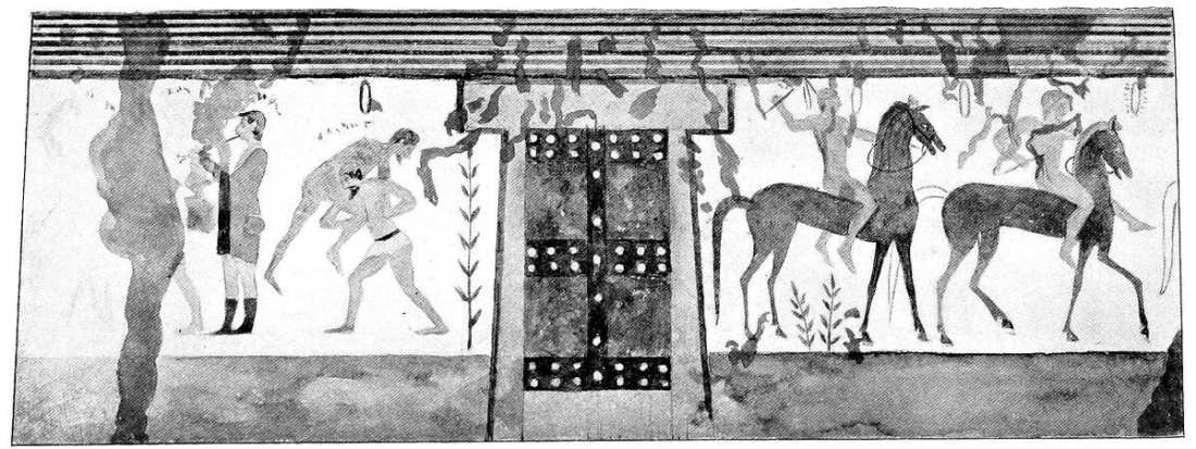 We may take the Tomba degli Auguri in Corneto, discovered in 1878, as our starting-point. There are coloured drawings as well as full-sized facsimiles of its pictures in the Helbig Museum.