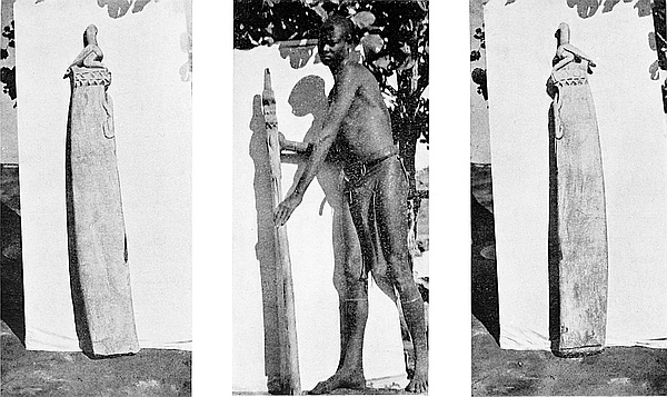 This open area, lying to the west and north of the Conical Tower and the Platform, corresponds to the open areas immediately in front of the altars in old Grecian temples. This was Mr. Bent’s opinion, and possibly it answered at Zimbabwe a similar purpose of accommodating the worshippers. The area, some 120 ft. by 60 ft., has been cleared out of large trees, and of about 6 ft. of soil throughout, and floors—both cement and clay—were disclosed, also a fine circular structure of excellent granite cement, and ascended by two steps. On and close to this structure were found fragments, mainly bases, of carved soapstone beams of slender appearance, also some phalli and gold. This platform lies slightly off the north line between the Conical Tower and the Main North Entrance.