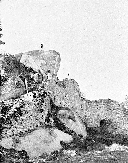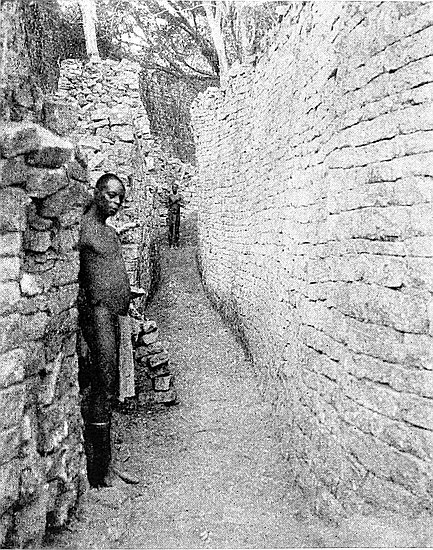The clearing of the area also disclosed clay sides of huts with the remains of short walls of stone radiating from the sides of the huts. The wall which Mr. Bent considered might have been the “altar” was found to be the radiating wall of a similar hut built upon a higher level. These small radiating walls are a general feature of exceedingly old native huts found at several places at Zimbabwe.