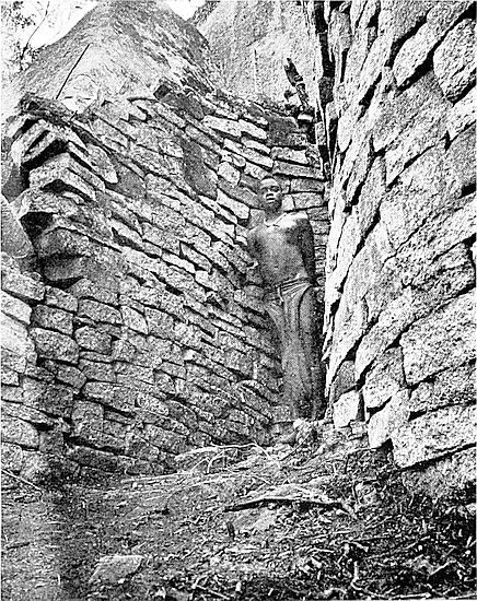 (a) The west wall is considered by all practical builders and architects to be far slighter, much inferior in construction, fuller of defects, and to contain to a greater extent ill-shaped stones than the main wall on the east side, while the foundations are at many points far more irregular, and the batter-back of the interior face of the west wall is less severe than is the case of the east side. Lengths of 25 ft. each of both walls have been examined and compared and photographed, and the number of defects of construction recorded. The number of false and “straight joints,” false and disappearing courses, and stones supported at their corners by granite chips, which the west wall contains, is roughly about forty odd to every one of such defects in the east wall, which is the architectural marvel for symmetry, grand proportion, true courses of most carefully selected and assorted blocks (somexxv of which have been dressed with metal tools) of any other ancient architectural features at Zimbabwe. All this is an ocular demonstration, and is commented upon by the most casual visitor to these ruins. This, too, is very patent when seen from the summit of Zimbabwe Hill, the view looking down upon the temple revealing most obviously the different characters of the walls.